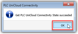 The PLC UniCloud Connectivity State succeeded screen is displayed below. Click OK.