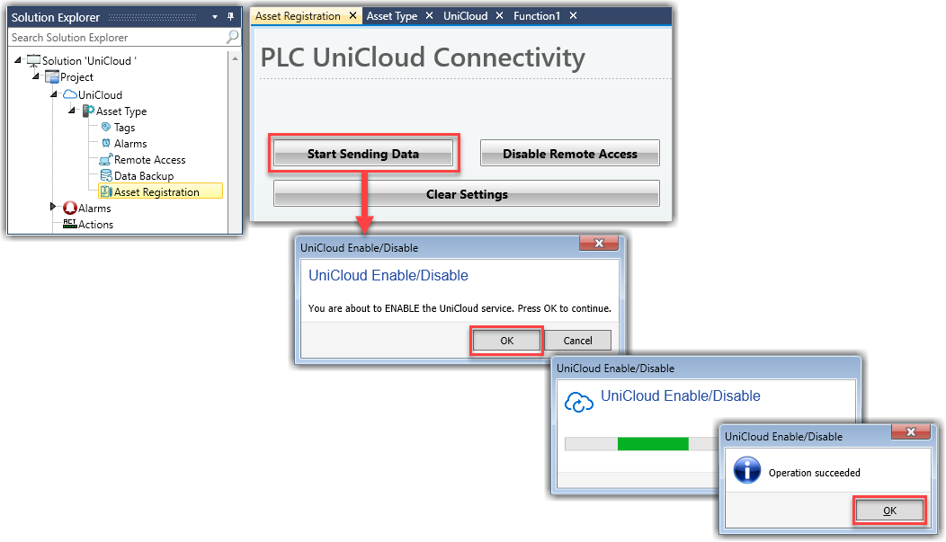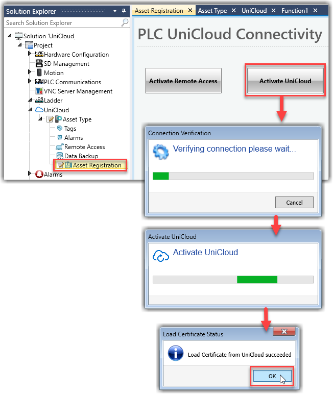 In the Solution Explorer, click UniCloud > Asset Type > Asset Registration, and then click Read PLC UniCloud Connectivity State.