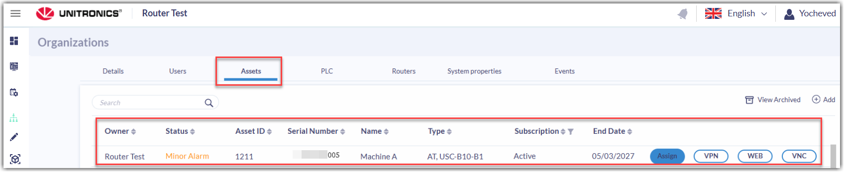 The communication status is now shown as Connected; UniCloud can now access the Asset and harvest data.