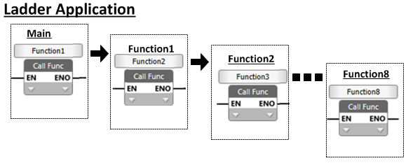 Each function may contain up to 10 Function in parameters and 10 Function out parameters, and may contain up to 256 bytes of local tags of any Data Type.