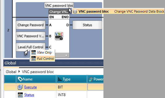You can configure a VNC Server password and access level within UniLogic and change them via ladder with the Change VNC Server Password function block.