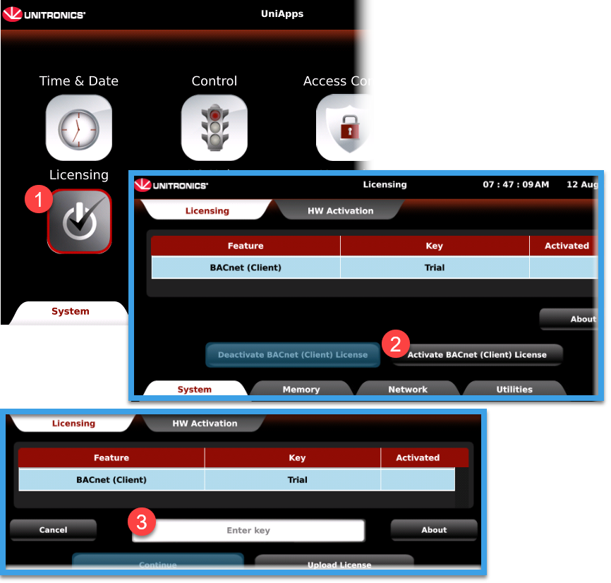 In UniApps, select Licensing > Activate BACnet (Client) License > Enter Key and follow the on-screen instructions for Activation.