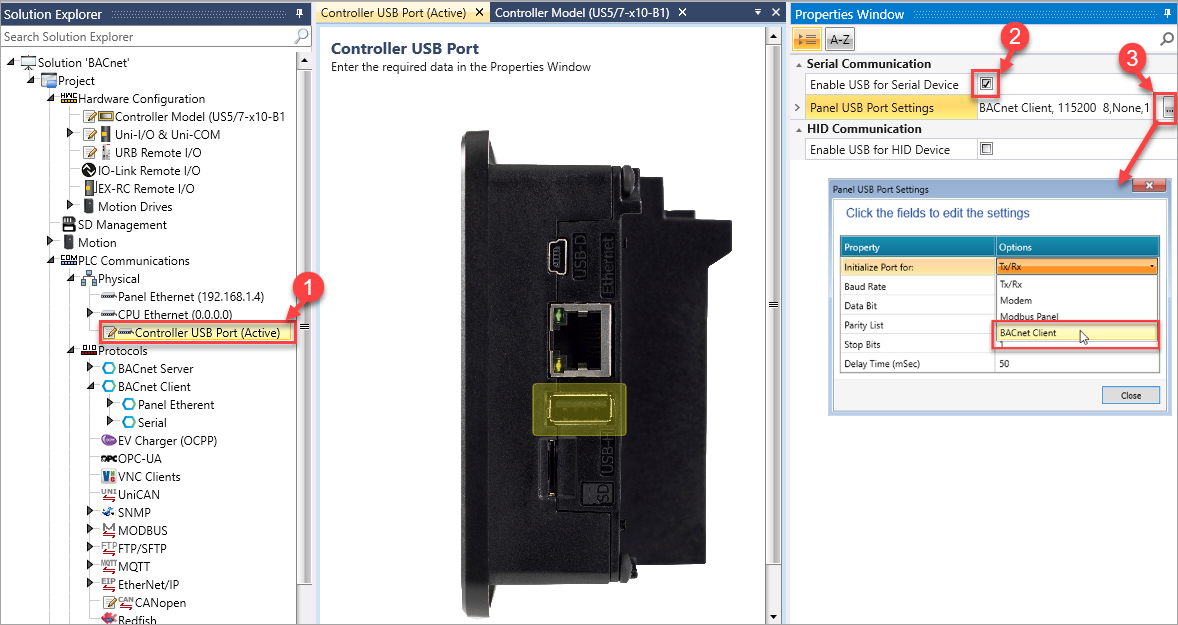 In the Properties Window, enable the USB for serial device, and from the Panel USB Port Settings drop-down options, initialize the port for BACnet Client.