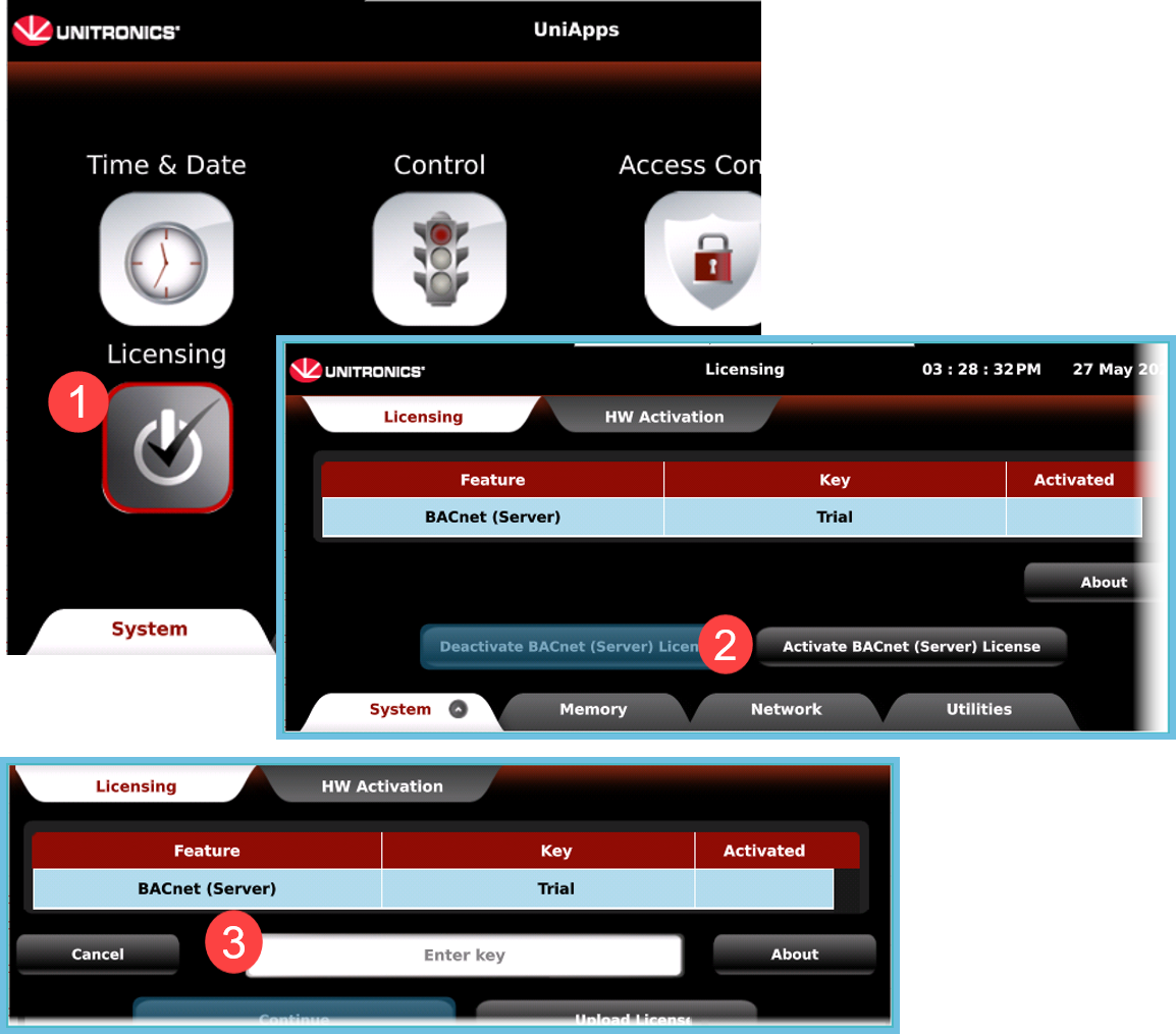 In UniApps, select Licensing > Activate BACnet (Server) License > Enter Key and follow the on-screen instructions for Activation.