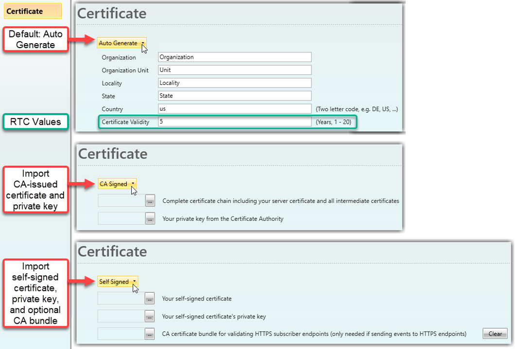 Select the certificate type: Auto Generate (Default): Certificate is auto-generated for users with an SD card and saved in "/ExternalSD/Redfish/RedfishUniStreamCert.crt" Note that a new Certificate is generated whenever an IP address changes, therefore, upon changing the PLC Panel IP, download the Certificate again from the SD card. Note that the RTC in the PLC must be set correctly in order to correctly implement the Certificate Validity. CA Signed: Import certificates signed by a Certificate Authority. Self Signed: Import user-generated self-signed certificates. Note that projects upgraded from previous versions are automatically mapped to CA Signed certificates. If Self Signed certificates are used, events will not be sent until an additional CA bundle is supplied.