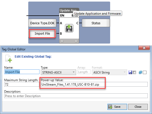 You can use the Update Application function to install a project file in order to upgrade an existing application, or application and firmware from a compressed, encrypted project file on an SD card or USB flash drive that is installed in a controller.