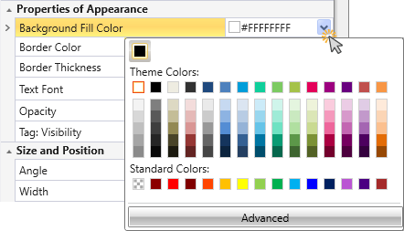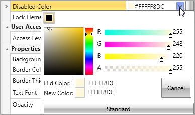 The Disabled Color is applied to an element when the Touch Control bit is OFF. To modify the default color, click the drop-down arrow located on the right side and select your preferred color.