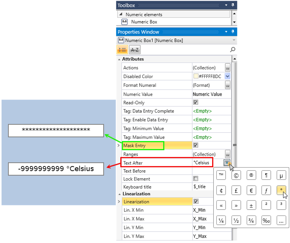 To enable the end-user to securely hide numeric inputs, check the Mask Entry. When it's checked, the number of '*' matches the length of the numeric value, including the sign. |