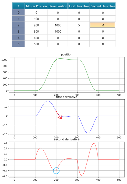 The slope angle at Master Position 200 has changed after setting the first derivative parameter value to 5. This adjustment means that the slave axis will reach this point with a nonzero velocity and zero acceleration: