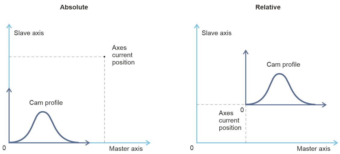 1 = absolute; 0 = relative coordinates If set to true, the Cam profile origin aligns with the axes origin; otherwise, the Cam profile origin is set to the current axes positions the moment the MC_CamIn execute bit is activated. This can be useful when camming needs to begin from the current position