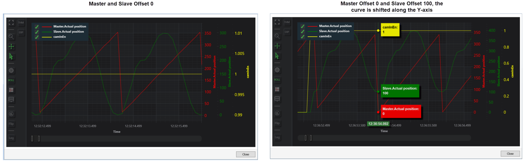 Looking at the slavePos = CAM(masterPos) curve, it will appear identical to the original curve but shifted along the Y-axis by the slave offset.