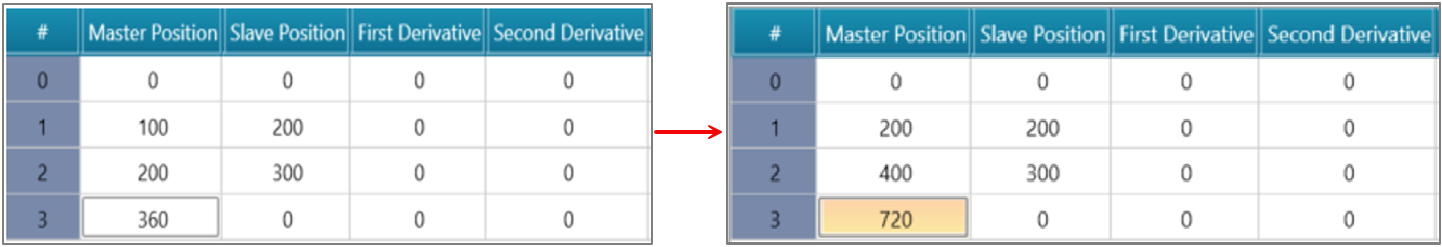 Master Scaling / Slave Scaling: Resizes the CAM table by multiplying all master and slave positions by the specified scaling coefficients.