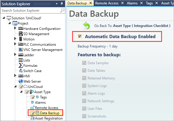Alarms: in the Solution Explorer, click UniCloud > Asset Type > Alarms, and then click Enable Alarms for UniCloud.