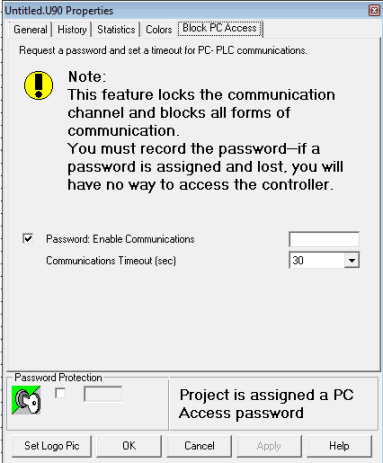 You can assign a password that prevents any communication channel from being opened to the PLC. If you enable this feature and assign a password to the channel, any attempt to communicate with the PLC will result in a request to enter a password.