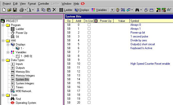 System Bits are the Operating System interface to the user writing the application. System Bits are reserved by the Operating System for particular functions. Some System Bits, for example, are connected to the PLC's keypad keys.