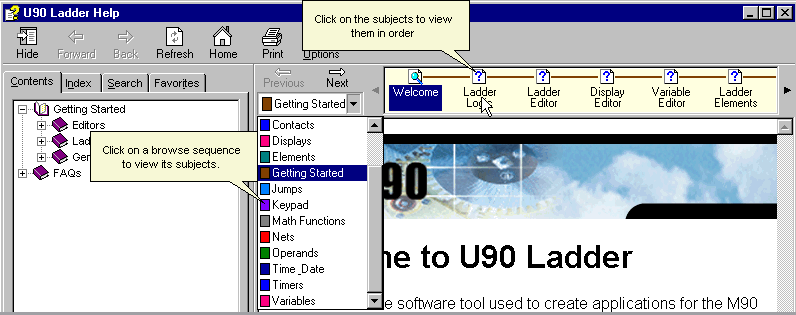 Use the Help browser to learn how to use U90 Ladder effectively. Topics in a browse sequence are classed according to subject. This enables you to see related topics without conducting a search.