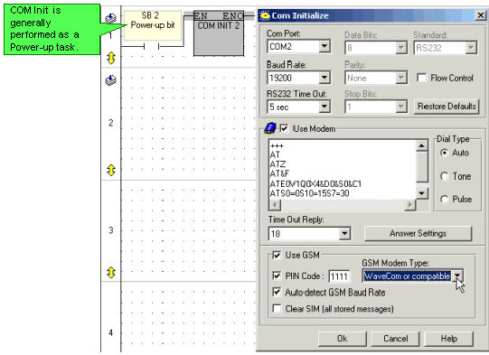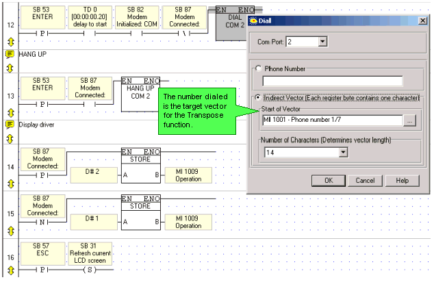 The net shown below is the first net of the main program module. When COM 2 is initialized, SB 82 Modem Initialized: COM 2 turns ON; this condition activates the Dial function in the next subroutine, Enter Phone Number.
