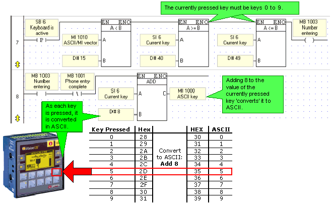 Displays the numbers as they are entered, via the HMI variable Display ASCII String, which displays the Phone Number vector starting at MI 1001.