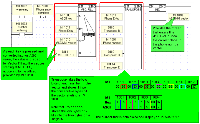 A Transpose function is linked to the vector starting at MI1011. Transpose copies the low byte of each register in that vector, and stores it into the consecutive bytes of a vector that starts at MI 1001, the Phone Number Vector. For example, Transpose can extract the low bytes from MI 1011,1012, 1013 & 1013 and store all 4 bytes into MI 1001 and 1002.