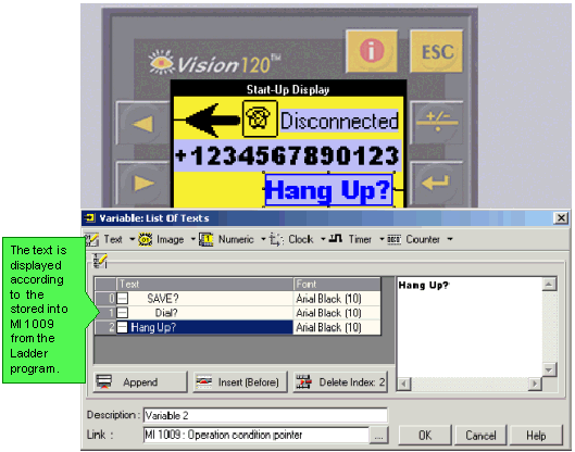 If your controller is hooked up to a modem, a phone number may be dialed from the controller's keypad. This explanation is based on a sample application that is installed on your hard disk together with VisiLogic. To open this application, open the Help menu, click Examples, and then select Dialing via Vision Keypad.