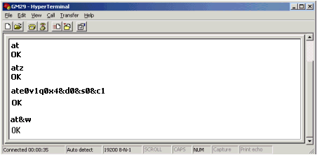 To test the connection, type AT; if the connection is valid the modem will respond 'OK'.