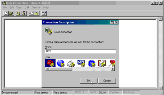 Enter a name for the new connection and select an icon, and then click OK. The Connect To box opens .
