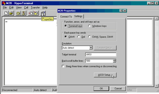 Open the modem’s Properties box by clicking on the Properties button, then open ASCII Setup.