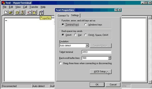 Open the Properties box by clicking on the Properties button, then open ASCII Setup.
