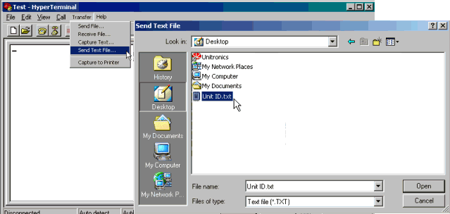 Via Hyperterminal, you can check the PLC-PC communication connection by sending a simple text command, Get ID. If the connection is in order, the controller replies with its ID; if the connection is faulty, the controller will not reply.