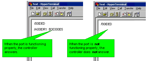 If you have configured everything according to the instructions above, and the port is functioning properly, the controller with its ID number. If the port is out of order, the controller will not reply.