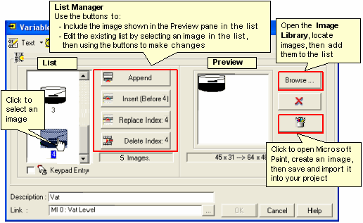 This type of Variable contains a list of numbered images. You link the Variable to an operand. The value within that operand 'points' to the number of an image within the list. When the operand value is equal to a particular image's number, that image is shown in the Display.