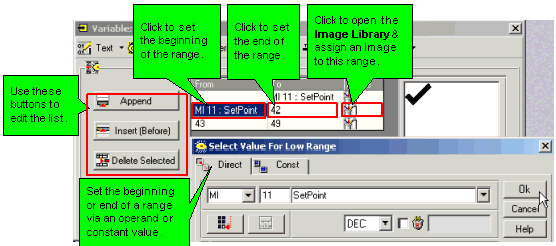 This type of Variable contains a list of images. You define a range of values for each image and link the Variable to an operand. The value within this operand is compared to the range you have defined for each image. When the operand value falls within a specified range, the image assigned to that range is shown in the Display.