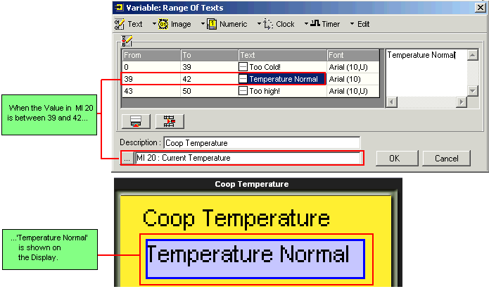 This type of Variable contains lines. You define a range and enter text for each line, and link the Variable to an operand. The value within this operand is compared to the ranges you have defined for each line. When the operand value falls within a specified range, the text assigned to that range is shown in the Display.