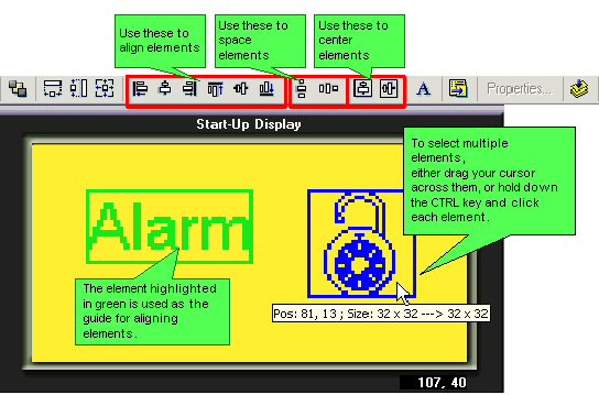 When you align, space, and center elements, be careful not to make them the same size and align them one on top of the other. If elements are 'fused' together in this way, they cannot be separated.