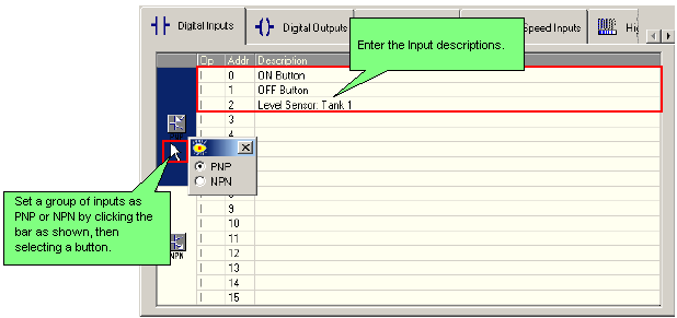 PNP/NPN must be set within the hardware, as explained in the technical specifications supplied with the I/O module. The program settings do not influence the actual hardware input setting. |