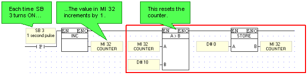 Note ♦ Do not use the Equal (=) function together with high-speed counter values, meaning the high-speed counters included in the controller's hardware. If the counter does not reach the value required by the Equal function during the actual program scan, the function cannot register that the value has been reached. Use functions Greater Than Or Equal To ( ≥) and Lesser Than Or Equal To ( ≤).