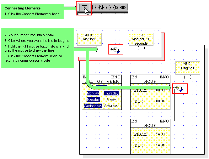 Use the Connect Elements tool to connect two or more elements or functions in a net. All net elements must be connected in order to allow power to flow through the net. If they are not connected you will not be able to compile your application.
