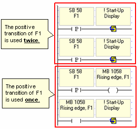 Execution time for Positive and Negative Transition contacts is considerably greater than the execution time for direct and indirect contacts. However, you can decrease the amount of transitional contacts in your program. |