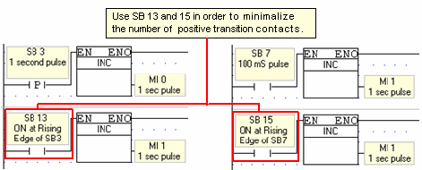 You can use the Direct Contact of SB 13 instead of using the Positive Transition Contact of SB 3, and the Direct Contact of SB 15 instead of using the Positive Transition Contact of SB 7. SB 3 is a pulse generator, with a cycle time of 1 second and a duty cycle of 50% (0.5 seconds ON, 0.5 seconds OFF). SB 13 is the Positive Transition (rising edge) contact of SB 3. SB 7 is a also a pulse generator, with a cycle time of 0.1 second. SB 15 is the Positive Transition (rising edge) contact of SB 7.