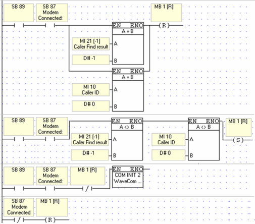 The ladder net that is shown below causes the following events when the PLC's modem receives a call from a remote modem: