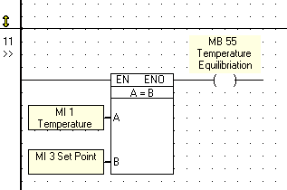 The Equal function block compares the value of input A to input B.