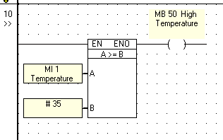 If MI 1 value is greater or equal to constant integer 35; then MB 50 will go to logic "1" (ON).