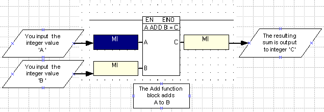 The example below shows an Add function block with 2 input values.