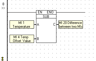 The math function Subtract is executed by the Subtract function block shown below. The function is located on the Math menu.