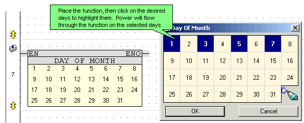 The Day of the Month function enables you to assign tasks or run programs on specific days, such as the 14th and 21st of a month, according to the RTC calendar embedded in the controller.