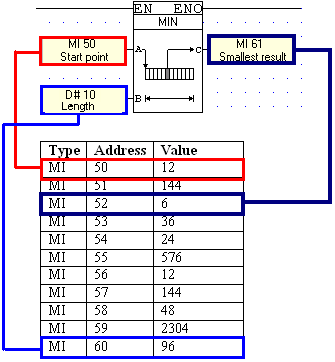 In the example below, the function checks MI 50 through 60. The smallest value in the range, 6, is contained in MI 52; therefore 6 is stored in MI 61.