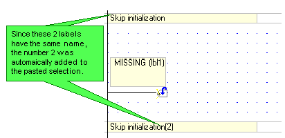 If the selection contains Labels or Jumps with the same name as those in the target project, these will be automatically renamed by the program when they are pasted.