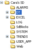 If a PLC contains an SD card, and the PLC application comprises Alarms, the PLC stores the first 8 Alarms in RAM, and stores them in a . ual file in this folder. |