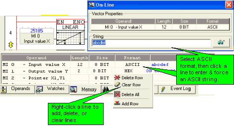 When ASCII is the selected format, you can click a line and force a string to the vector. Note that to force the value, you must click the 'eyeglass' symbol in the On-line window.