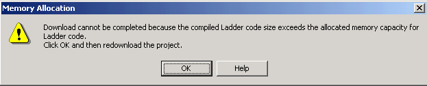 During download, Ladder code is compiled into machine code. The compiled code may exceed the memory that is allocated for compiled Ladder code. If the allocated memory is exceeded, the message below will appear at download.